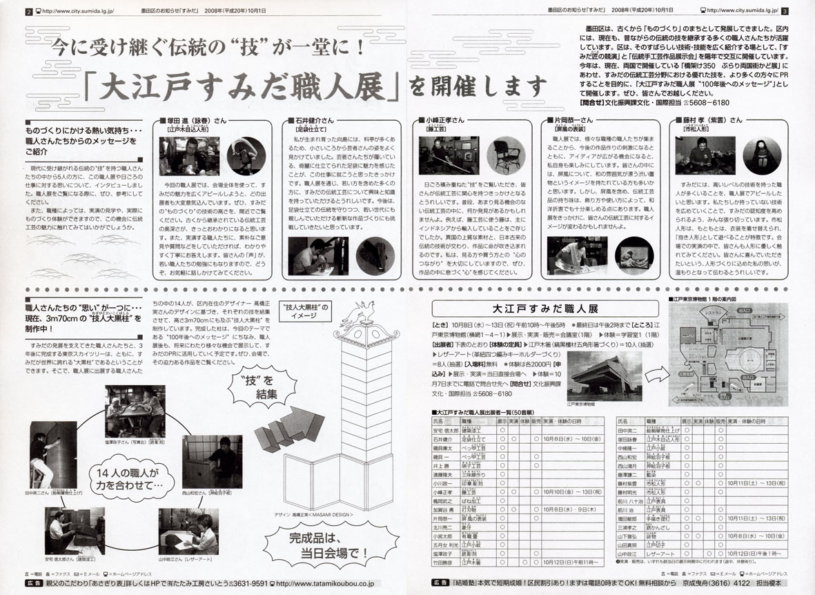 墨田区区報 『すみだ』 10月1日号にてご紹介頂きました墨田より区民に向けて毎月1日、11日、21日に発行しています新聞「すみだ」にて、今月8日から開催されます「大江戸すみだ職人展」の詳細が見開きで詳しく掲載されています。