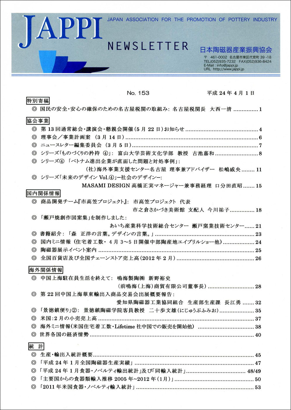 日本陶磁器産業振興協会(JAPPI)『NEWSLETTER153号』での