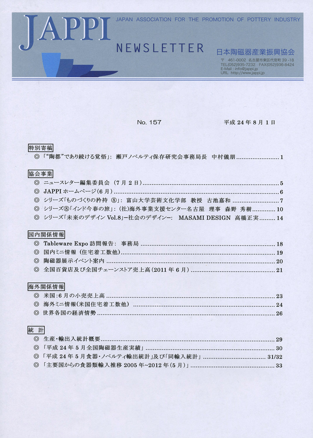 日本陶磁器産業振興協会(JAPPI)『NEWSLETTER 157号』での