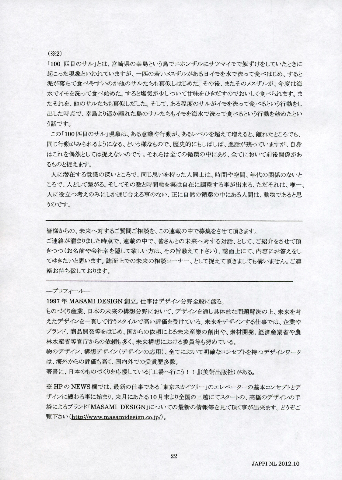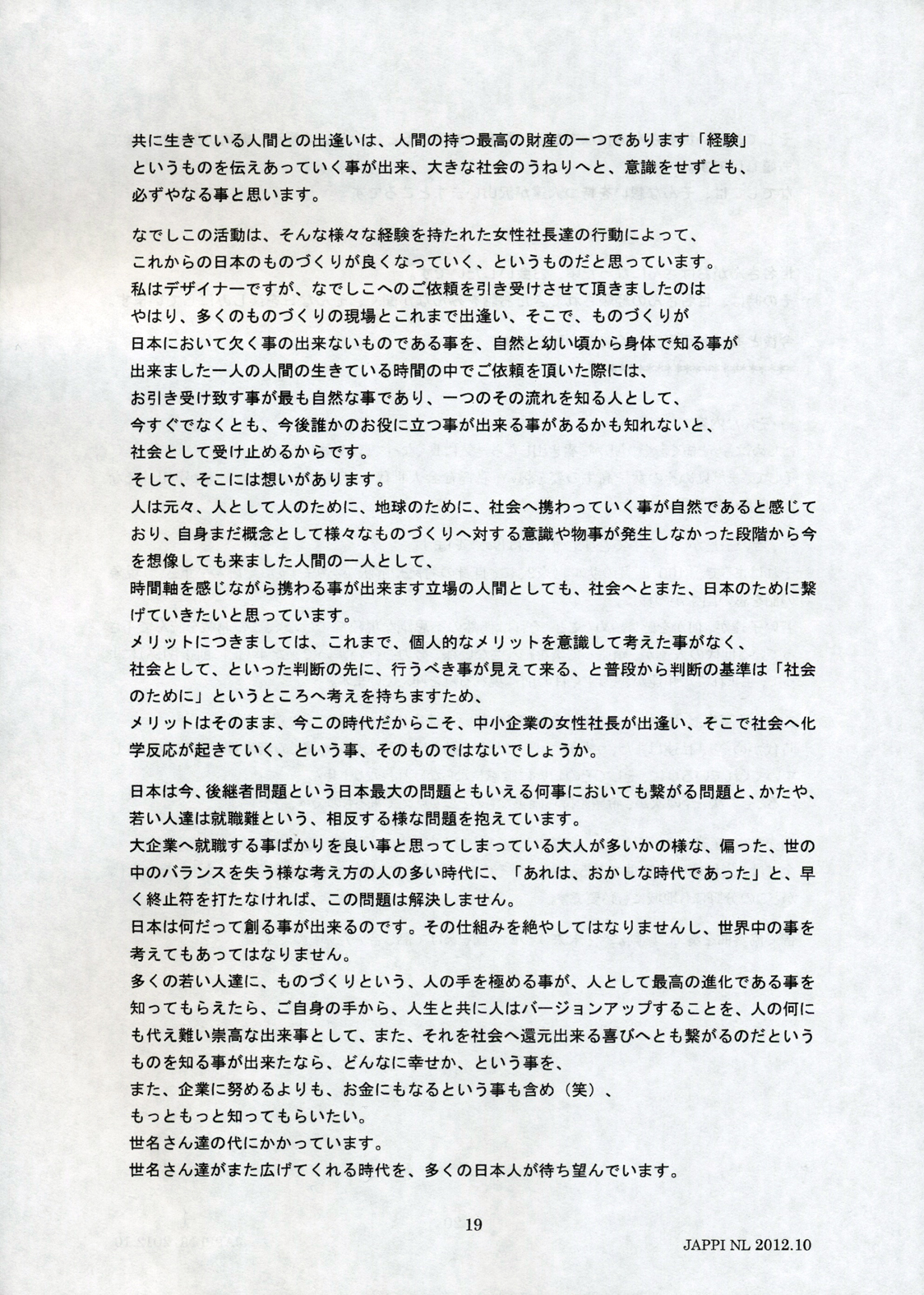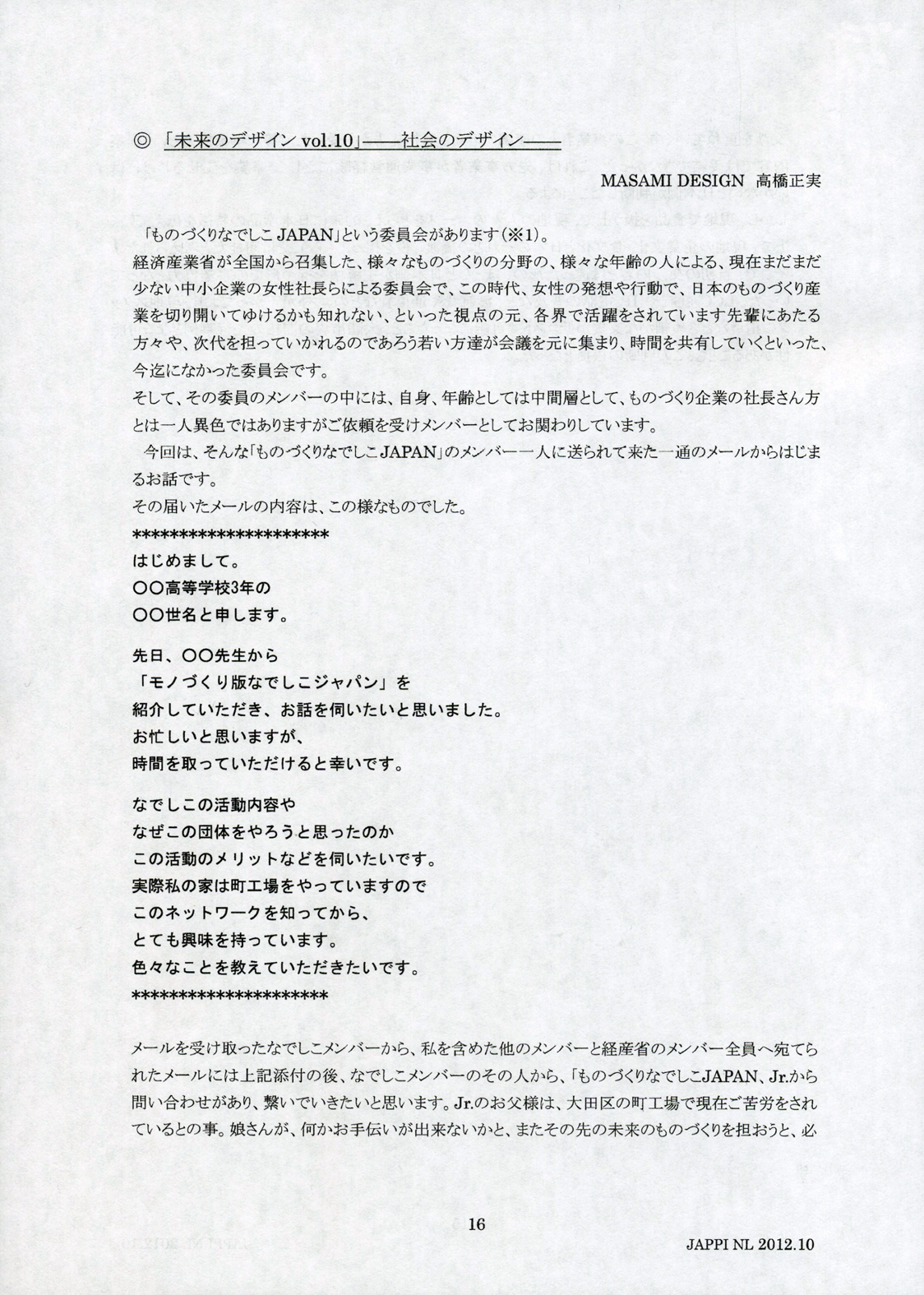 日本陶磁器産業振興協会(JAPPI)『NEWSLETTER 159号』での 高橋連載「未来のデザインVol.10〜社会のデザイン〜」(第十回目)を お届けします。 高橋の連載が掲載されており毎月日本陶磁器産業振興協会様より発行されて おります、 『NEWSLETTER 159号』の高橋執筆内容を第九回に引き続き ご紹介させて頂きます。 上段の向かって左上から右下の順でご覧いただけ ましたらと思います (最後のページは下段の一番右のページとなります)。
