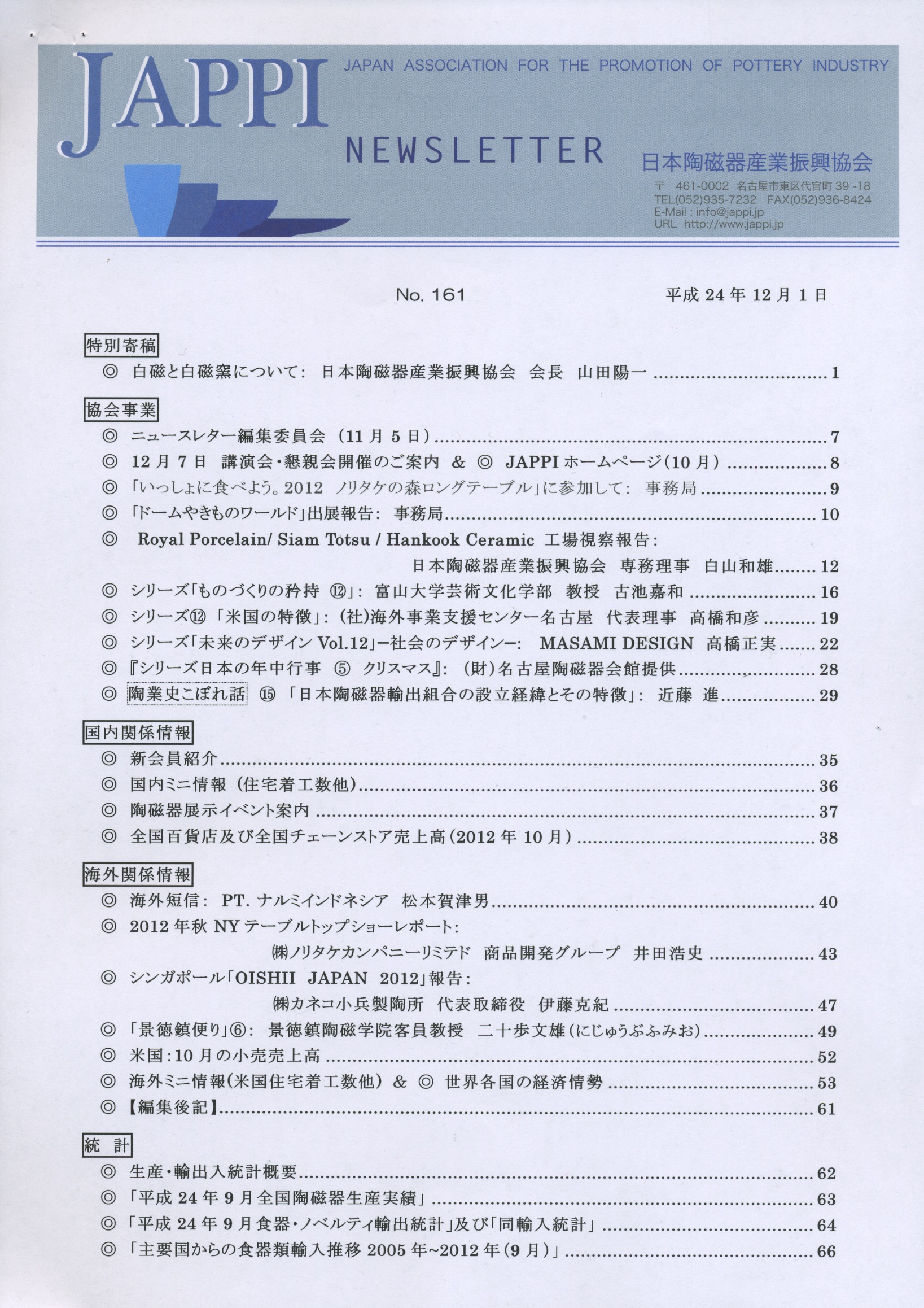 日本陶磁器産業振興協会(JAPPI)『NEWSLETTER 161号』での