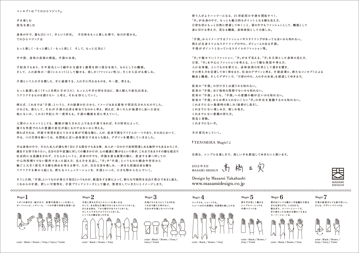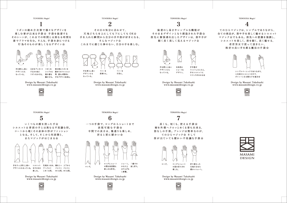 上記画像、上段左は、商品を包む包装紙中面で、高橋によります手袋コンセプトが入っています。