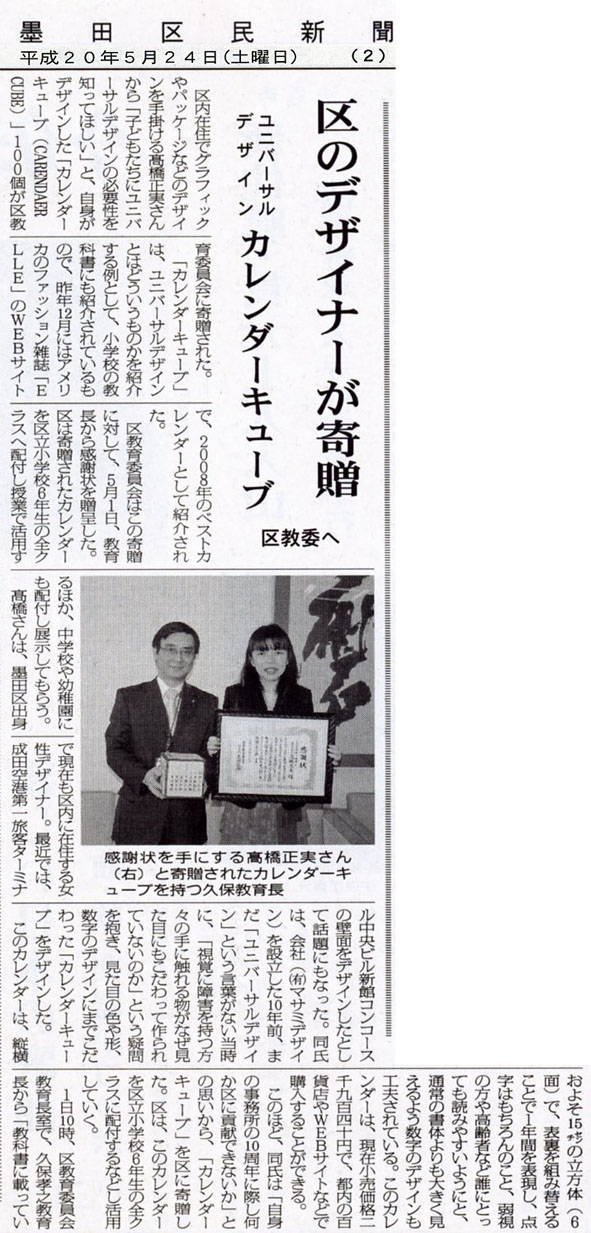 現在墨田区の小学校で採用されている社会科教科書(東京書籍)にカレンダーキューブが掲載(http://www.masamidesign.co.jp/works/write/write01.html)されていることから、「子供達の教育にお役に立てれば」という高橋の想いで、寄贈のお話をさせて頂きましたところ、墨田区役所にて墨田区教育委員会より表彰をしていただきました。