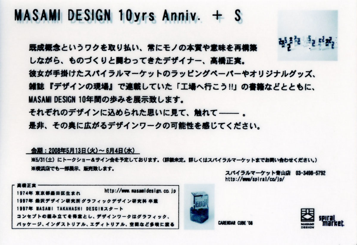 高橋が仕事開始当初から永いお付き合いをさせていただいています、スパイラルマーケットの皆様から「マサミデザイン創立10周年を記念した、スパイラルマーケットと共に歩んできた10年展」のお話を頂き、開催する事となりました!