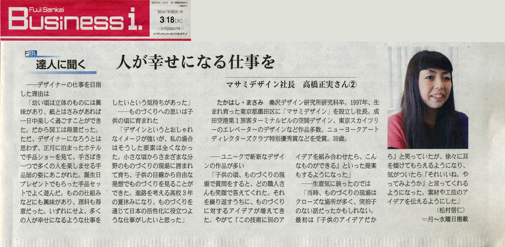 産經新聞経済紙『フジサンケイビジネスアイ』の連載コーナー「達人へ聞く」にて、