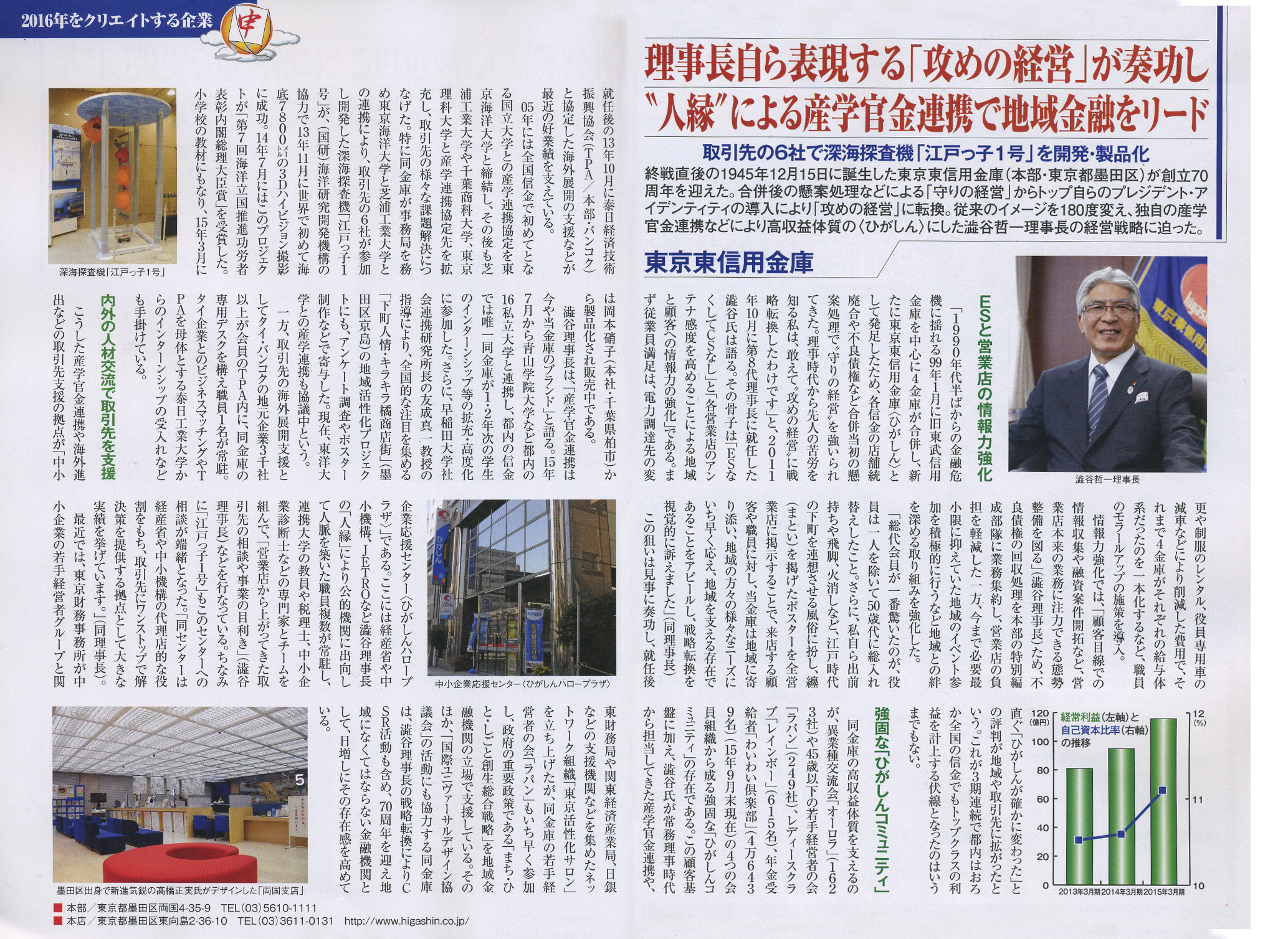 記事の中では、創立70周年を迎えた東京東信用金庫の経営戦略や、