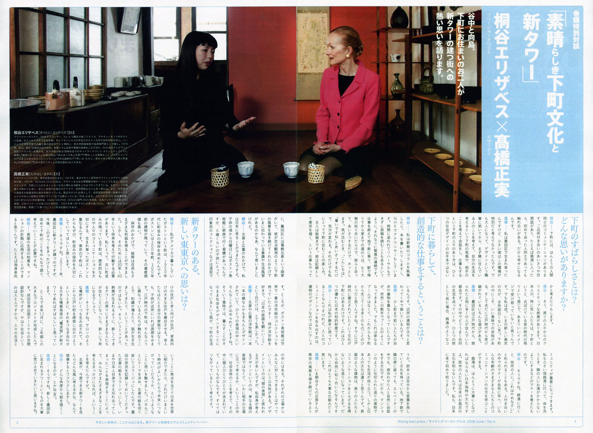 新タワーネーミングの決定で、全国にお知らせを出して行く第一弾として、「東京スカイツリー」と下町文化について高橋とジャーナリストの桐谷エリザベスさんの対談ページが掲載されています。