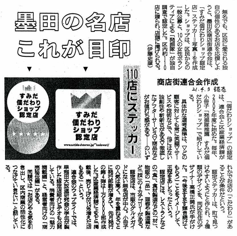 『讀賣新聞』にてご紹介いただきました今月の讀賣新聞にて、高橋がデザインしましたすみだ個だわりショップの認定証が掲載されました。