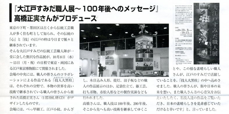また、高橋が昨年デザインした「技人大黒柱」についての内容と「大江戸すみだ職人展」の模様の写真が掲載されています。