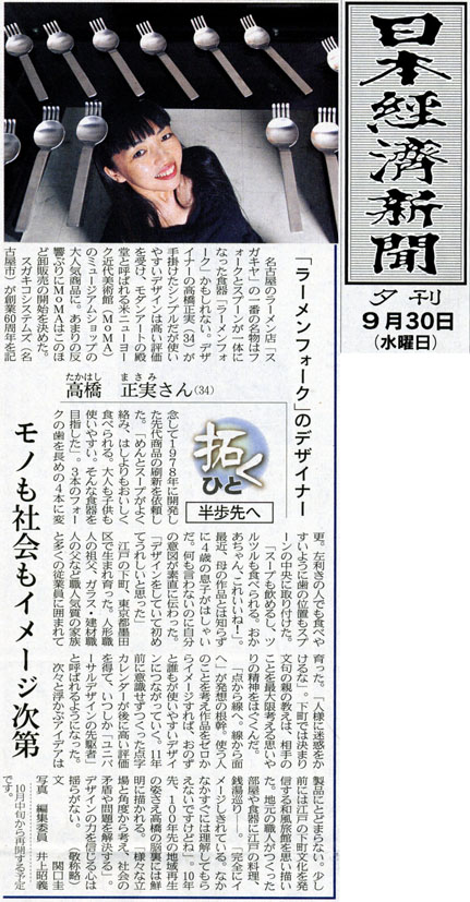 『日本経済新聞』一面にて、ご紹介頂きました9月30日夕刊の一面にて、高橋をご紹介いただきました。これまで行ってきた、10年先、100年先を見据えた、沢山の概念を作ってきた 仕事群から、「拓く人」としてご紹介を頂いています。