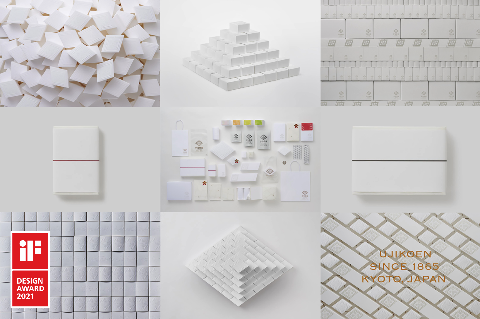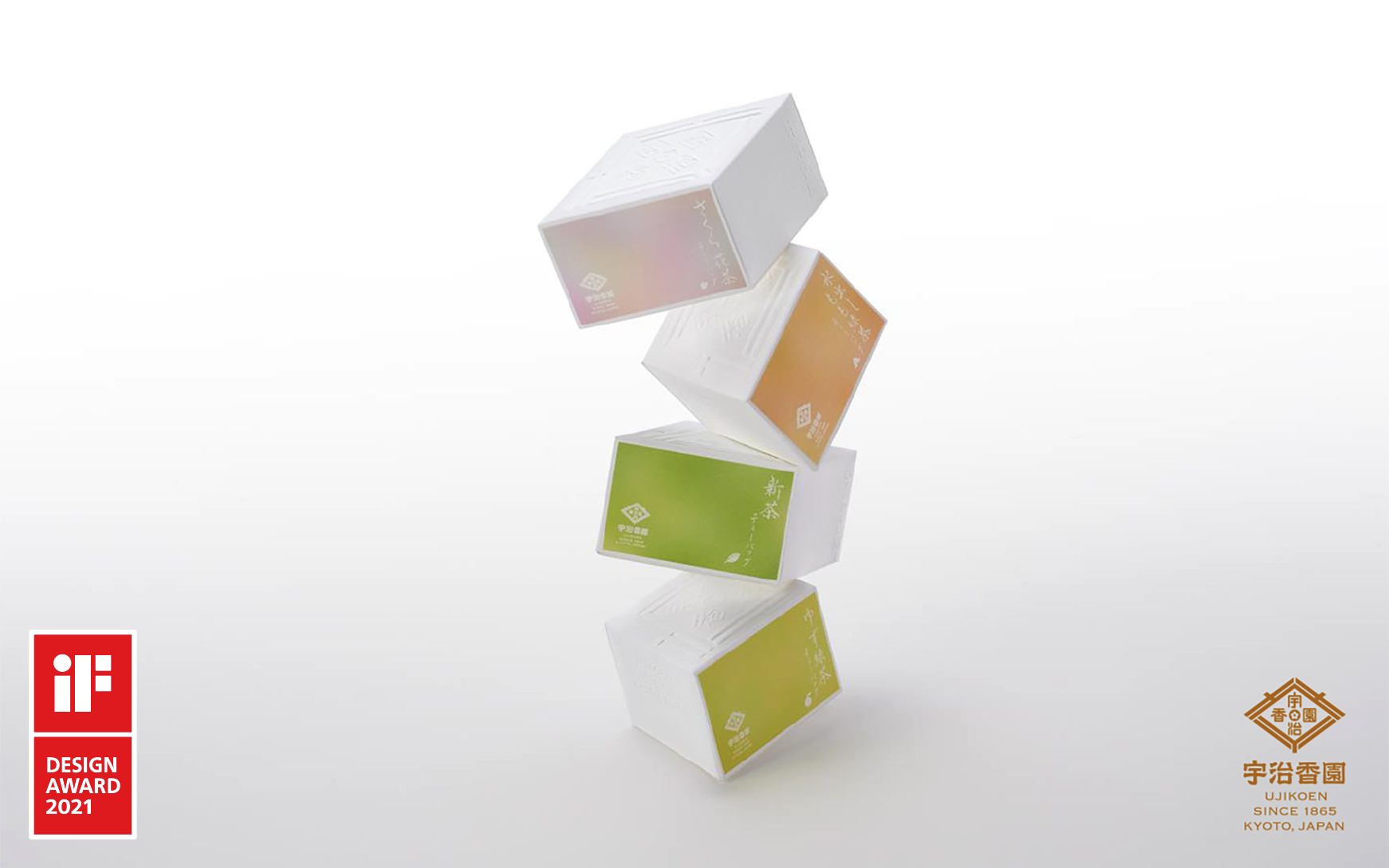 リニューアルデザインを行いましたロゴを、白い紙にエンボスであしらったデザインで、優しく、美味しく、美しく、楽しい、宇治香園のお茶の世界を届けられましたらと願っています。